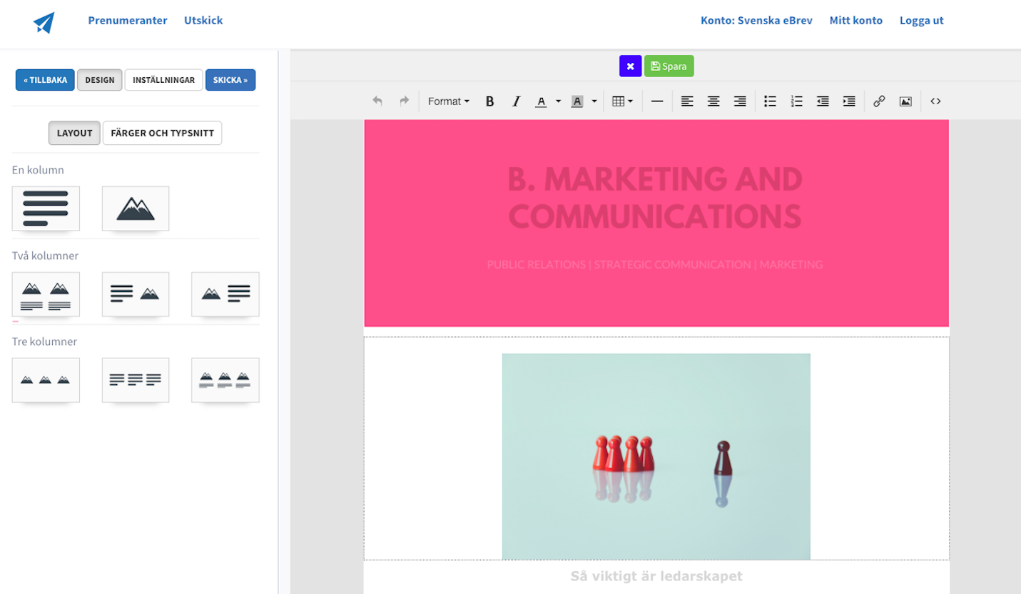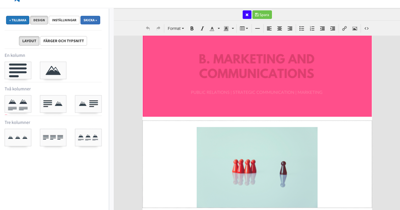 För att kunna aktivera redigeringsläget håller du pilen över den kolumn som du vill redigera, och klickar på den blå ikonen med pennan som centreras i mitten. När du sedan är inne i redigeringsläget kan du enkelt ändra storlek på rubriker, använda olika textjusteringar, välja bland olika textfärger samt infoga länkar. Kom ihåg att alltid klicka på “spara”-knappen för att inte gå miste om dina ändringar.